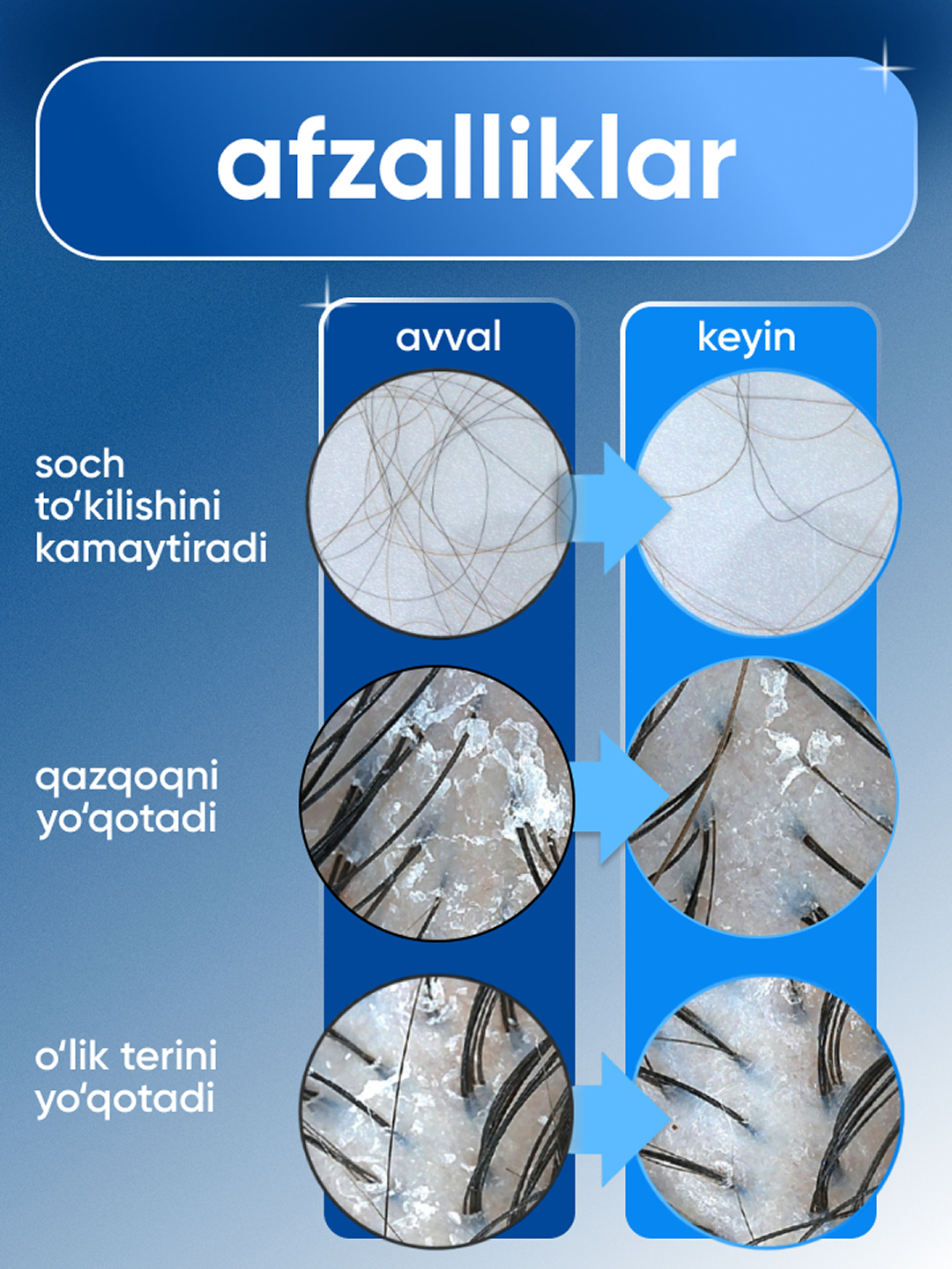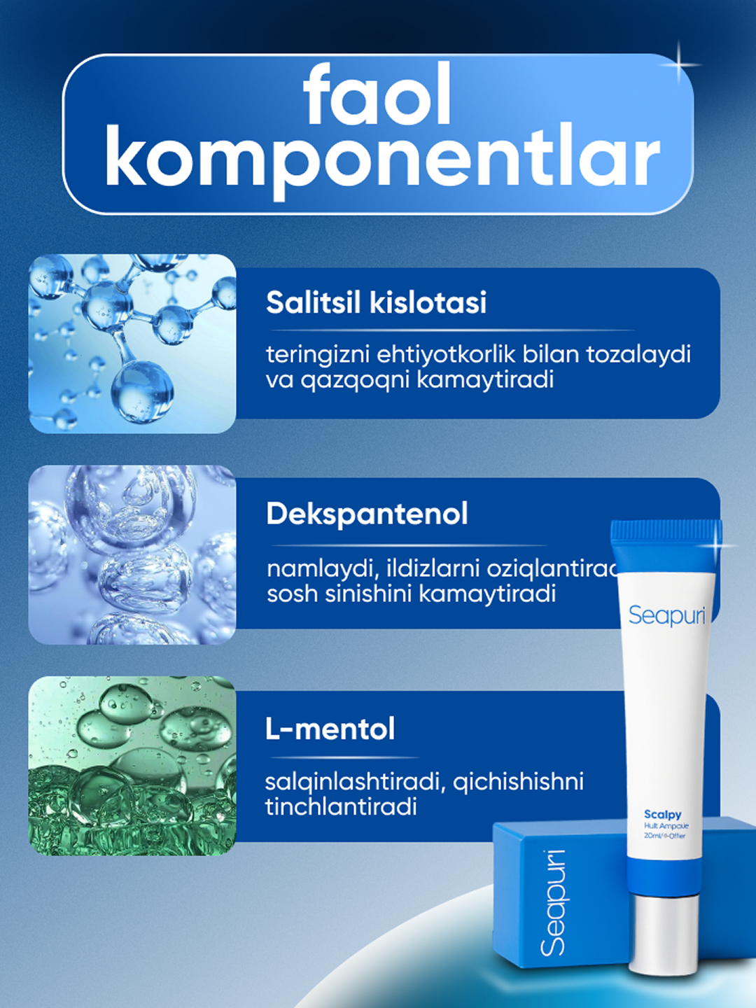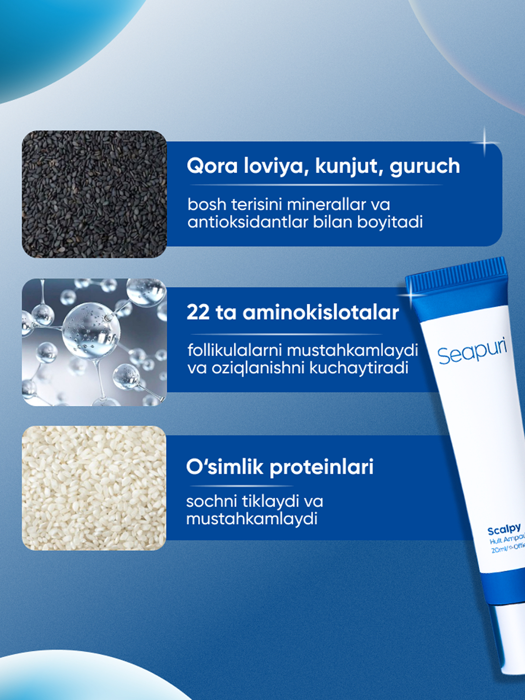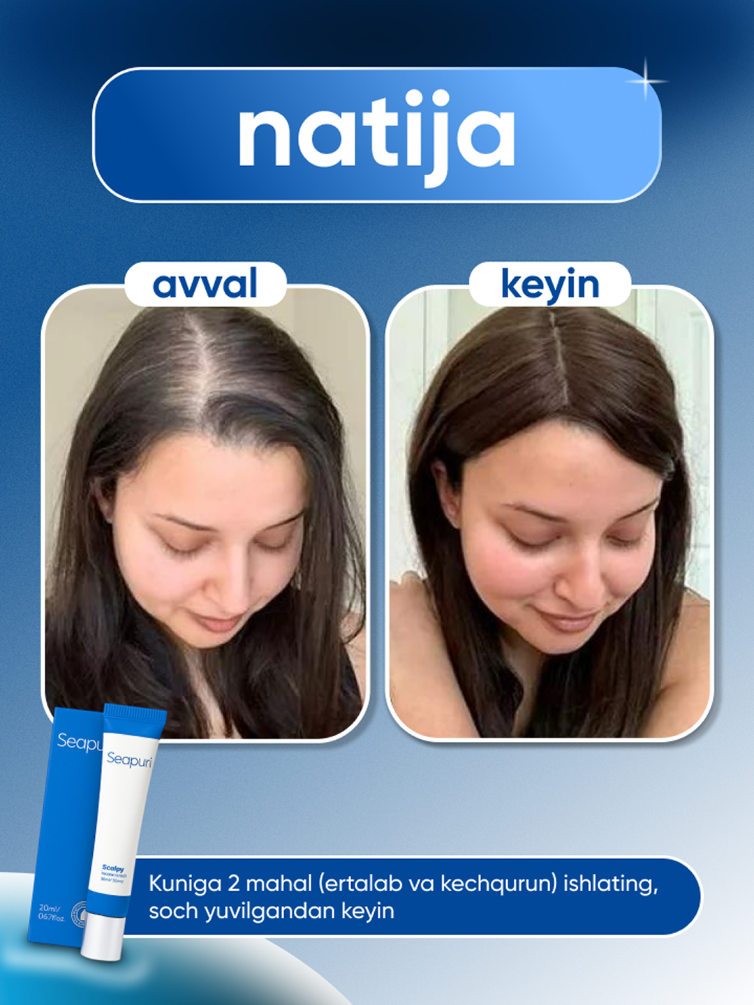 Scalp 2-in-1 soch uchun sivorodka ! Soch to'kilishini tõxtatadi , yangilaydi va tez õsishga yordam beradi . Scalpy sarum-bu bosh terisi va sochni parvarish qilishning aqlli usuli. U bir vaqtning o'zida ikki yo'nalishda ishlaydi: qulay aplikator tufayli soch to'kilishini davolaydi va bosh terisini massaj qiladi. Sarum nima qiladi: Tetiklantiruvchi va salqin L-mentolni o'z ichiga oladi-bosh terisini tinchlantiradi, qichishish va tirnash xususiyati yo'q qiladi. Sochni mustahkamlaydi va o'sishni rag'batlantiradi Salitsil kislotasi va dexpantenol tufayli terining holatini yaxshilaydi va yangi soch o'sishini faollashtiradi. Oziqlantiradi va parvarish qiladi Vitaminlar va ekstraktlar bilan boyitilgan formula bosh terisini chuqur oziqlantiradi, sochlarni mustahkam va qalin qiladi. Nima uchun sinab ko'rishga arziydi: ✔ Qulay massaj aplikatori ✔ Birinchi qo'llashdan sovutish effekti ✔ Muntazam foydalanish bilan ko'rinadigan natija